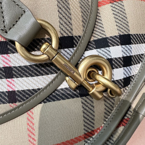 브랜드의 2025 여름 패션쇼에서 처음 선보인 부드럽고 탄탄한 메신저백입니다. 보호성이 뛰어난 면 혼방 원단으로 제작되었으며, 정교한 브랜드 전용 체크 패턴으로 장식하고 동일한 원단의 안감을 사용했습니다. 앞면 포켓의 b자형 버클에서 이름을 따왔으며, Burberry 로고가 새겨져 있습니다. 곡선형 디자인에 브러쉬 메탈 부착물과 수작업으로 봉제된 상단 손잡이가 더해져 말안장 모양에서 영감을 받았습니다. 조절 가능한 망사 어깨끈과 가죽 트림이 조화롭게 어우러지며, 승마 기사 로고 양각이 은은하게 포인트를 줍니다. 사이즈 27.5x11x19cm
